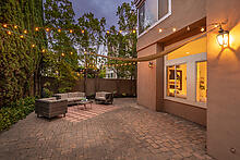 The modern eat-in kitchen is equipped with an island, stainless appliances and remote controlled custom window treatments. The adjacent family room offers direct access to the private patio perfect for al fresco dining and a serene outdoor oasis with a tranquil water feature.